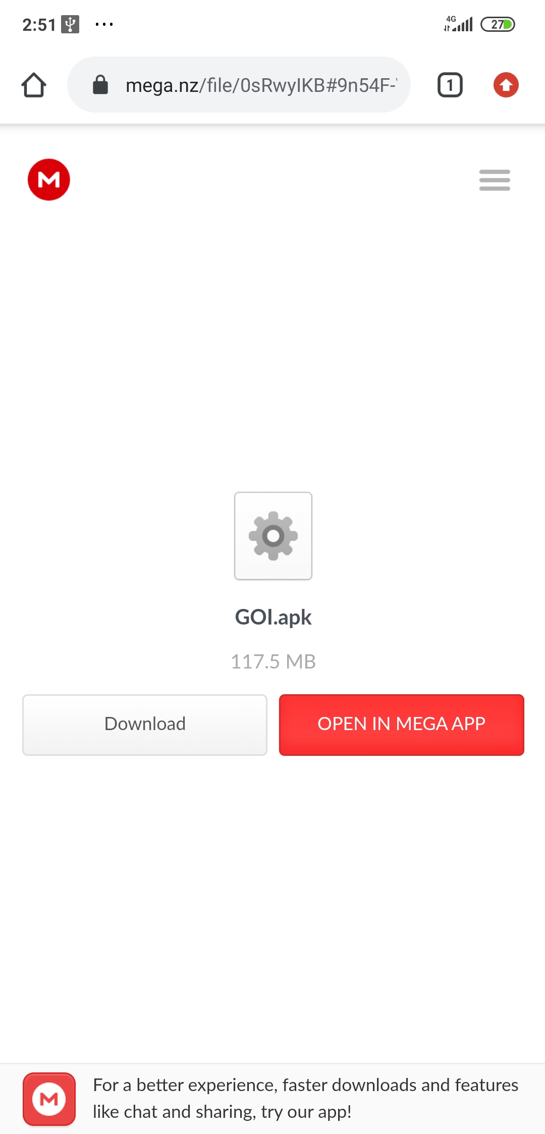 3) After loading ends there be a file name with the icon of what file type, and below it there are two options of ‘ download and open in mega app’.